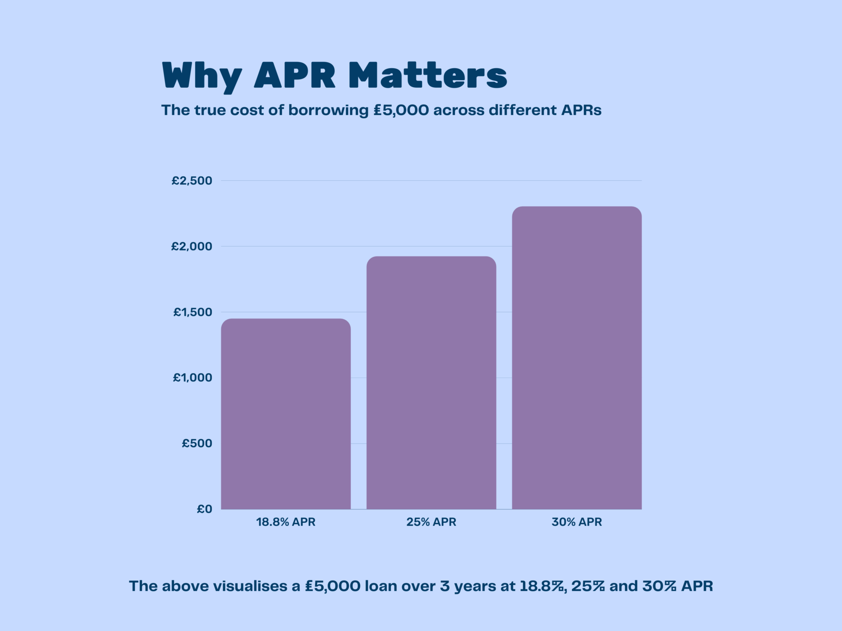 Because APR includes additional fees, it's a great way to compare different loans. So a 17.5% APR loan will be more expensive than a 12.5% loan, although you should always check the small print for hidden charges.